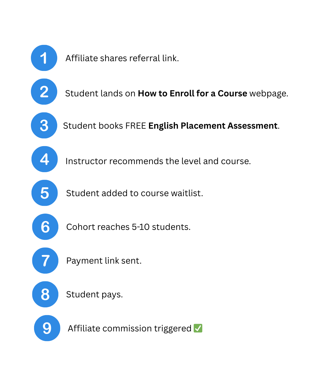- If the student completes English Placement Assessment, joins a cohort, and enrolls in a course, you earn a commission.